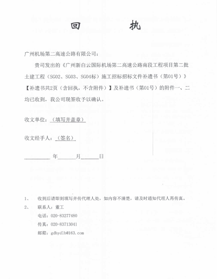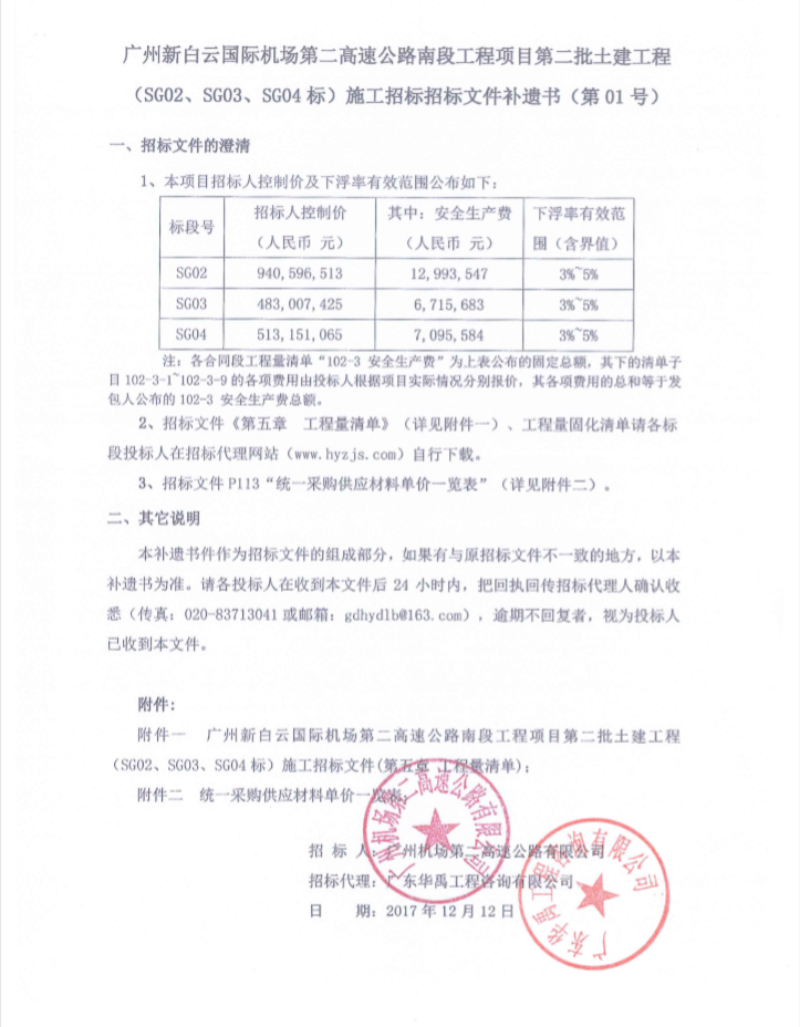 补遗书 - 广州新白云国际机场第二高速公路南段工程项目第二批土建工程(SG02、SG03、SG04标)施工方招标招标文件补遗书(第01号)