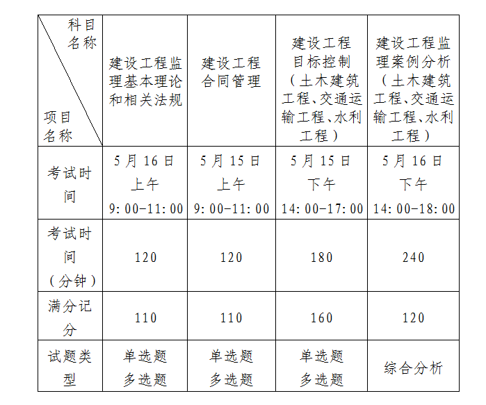 监理工程师职业资格考试设《建设工程监理基本理论和相关法规》(客观题)、《建设工程合同管理》(客观题)、《建设工程目标控制》(客观题)和《建设工程监理案例分析》(主观题)4个科目。其中《建设工程监理基本理论和相关法规》和《建设工程合同管理》为基础科目;《建设工程目标控制》和《建设工程监理案例分析》为专业科目。专业类别分为土木建筑工程、交通运输工程和水利工程,报考人员可根据实际工作需要选报其一。监理工程师职业资格考试成绩实行4年为一个周期的滚动管理,参加4个科目考试(考全科)的人员须在连续4个考试年度内通过全部应试科目;参加2个科目考试(免二科)的符合免试基础科目人员须在连续2个考试年度内通过相应应试科目,方可获得资格证书。已取得监理工程师一种专业职业资格证书的人员,报名参加其他专业科目考试的(增报专业),可免考基础科目,在连续2个考试年度内通过相应应试科目,可获得相应专业考试合格证明,该证明作为注册时增加执业专业类别的依据。