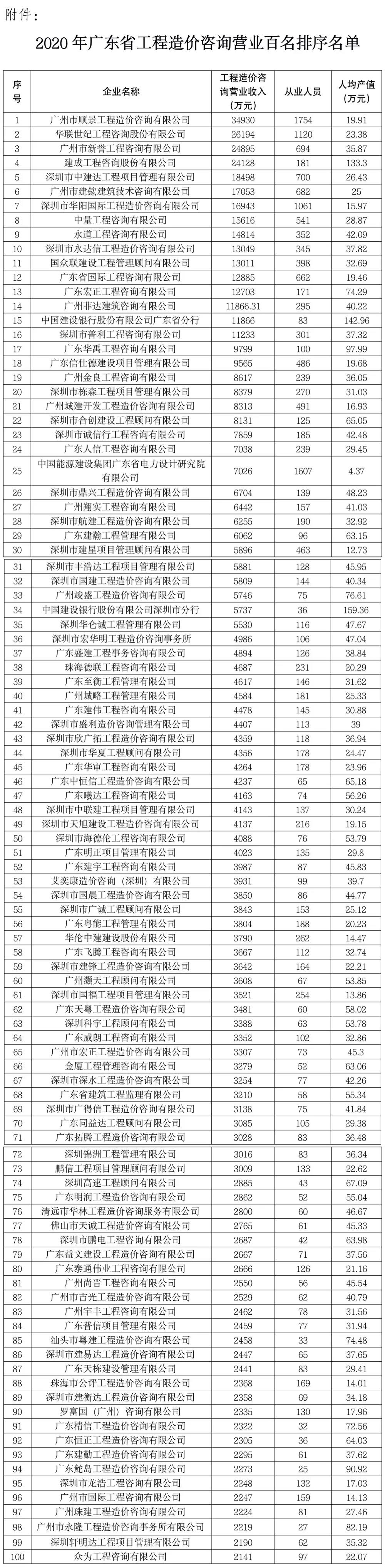 关于公布2020年广东省工程造价咨询企业 营业收入百名排序名单的通知
