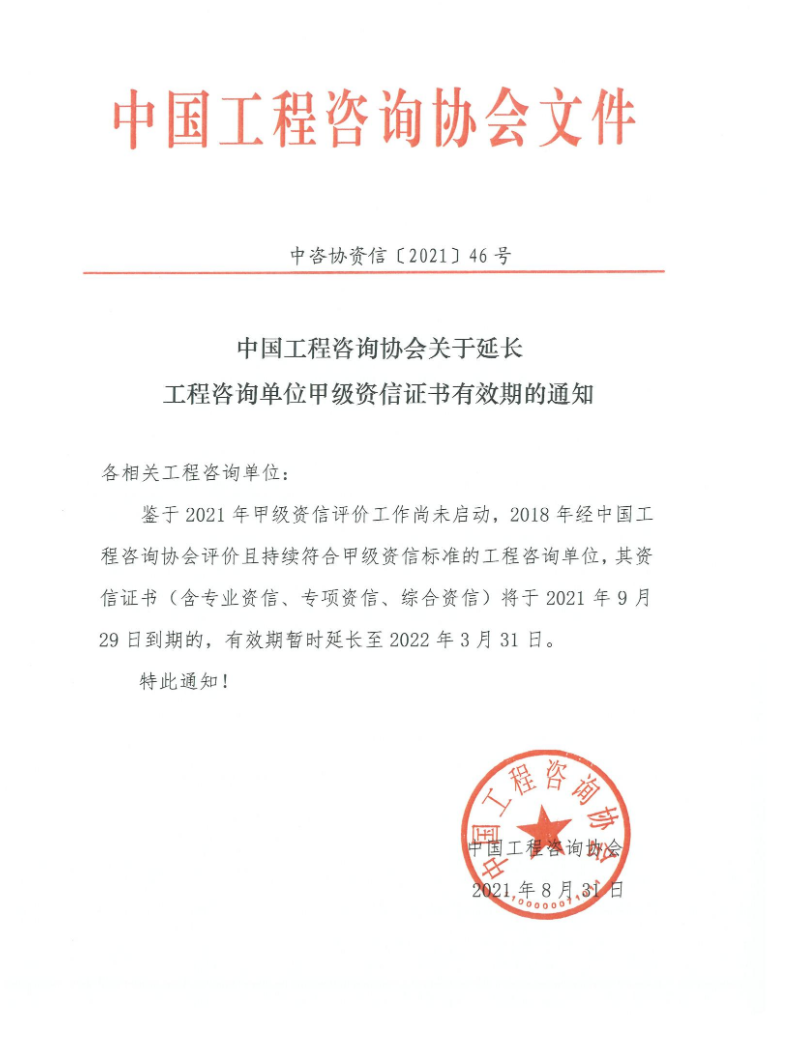 【转】中国工程咨询协会关于延长工程咨询单位甲级资信证书有效期的通知