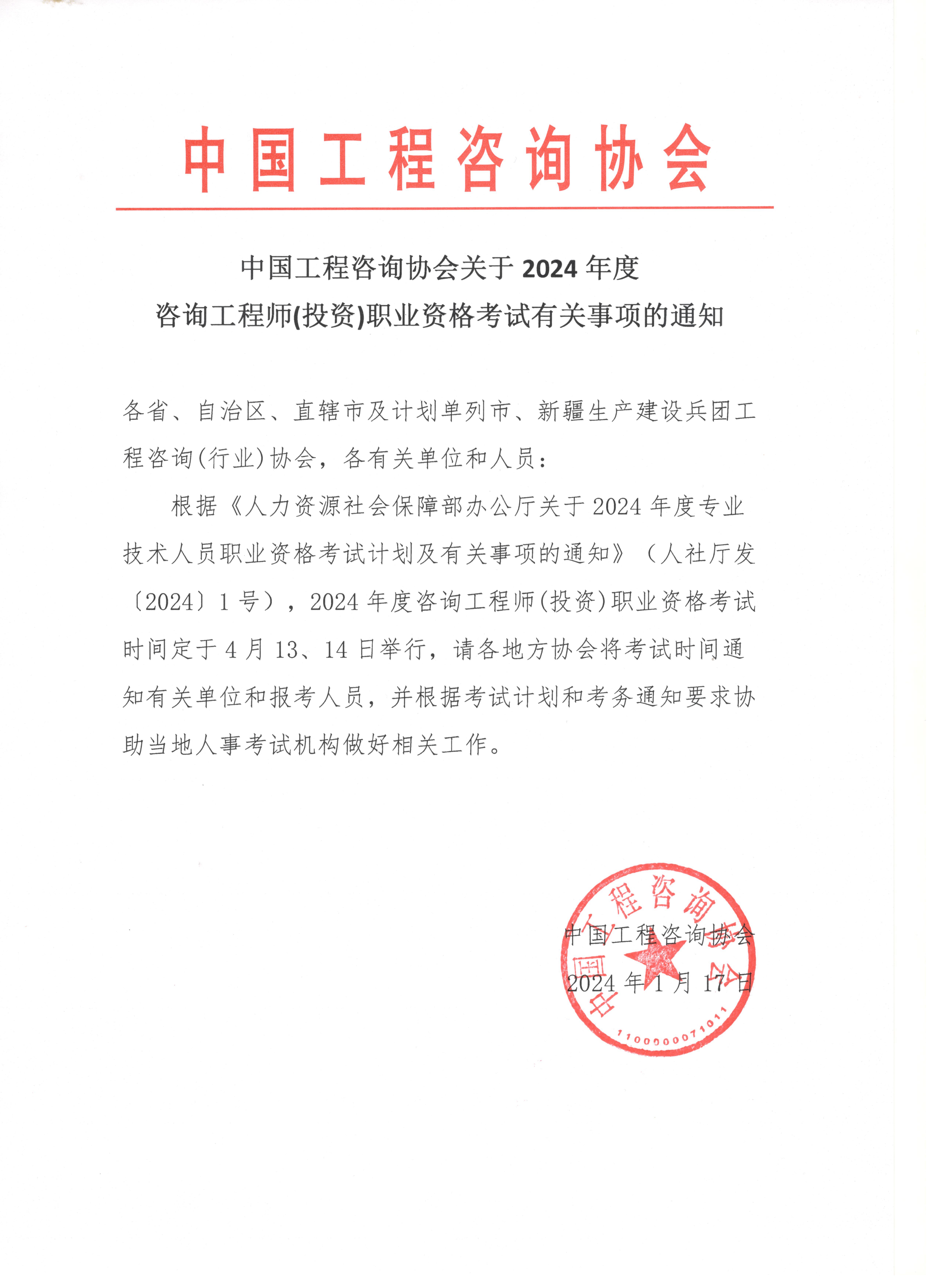【转】中国工程咨询协会关于2024年度咨询工程师(投资)职业资格考试有关事项的通知
